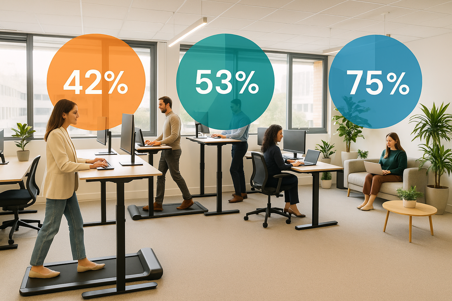 In Italia il 42% delle aziende ha un piano di welfare strutturato (che sale al 53% tra le imprese >1.000 dipendenti) e tra le PMI il 75% ha raggiunto almeno un livello medio di welfare: terreno ideale per postazioni attive, standing desk e WalkingPad.