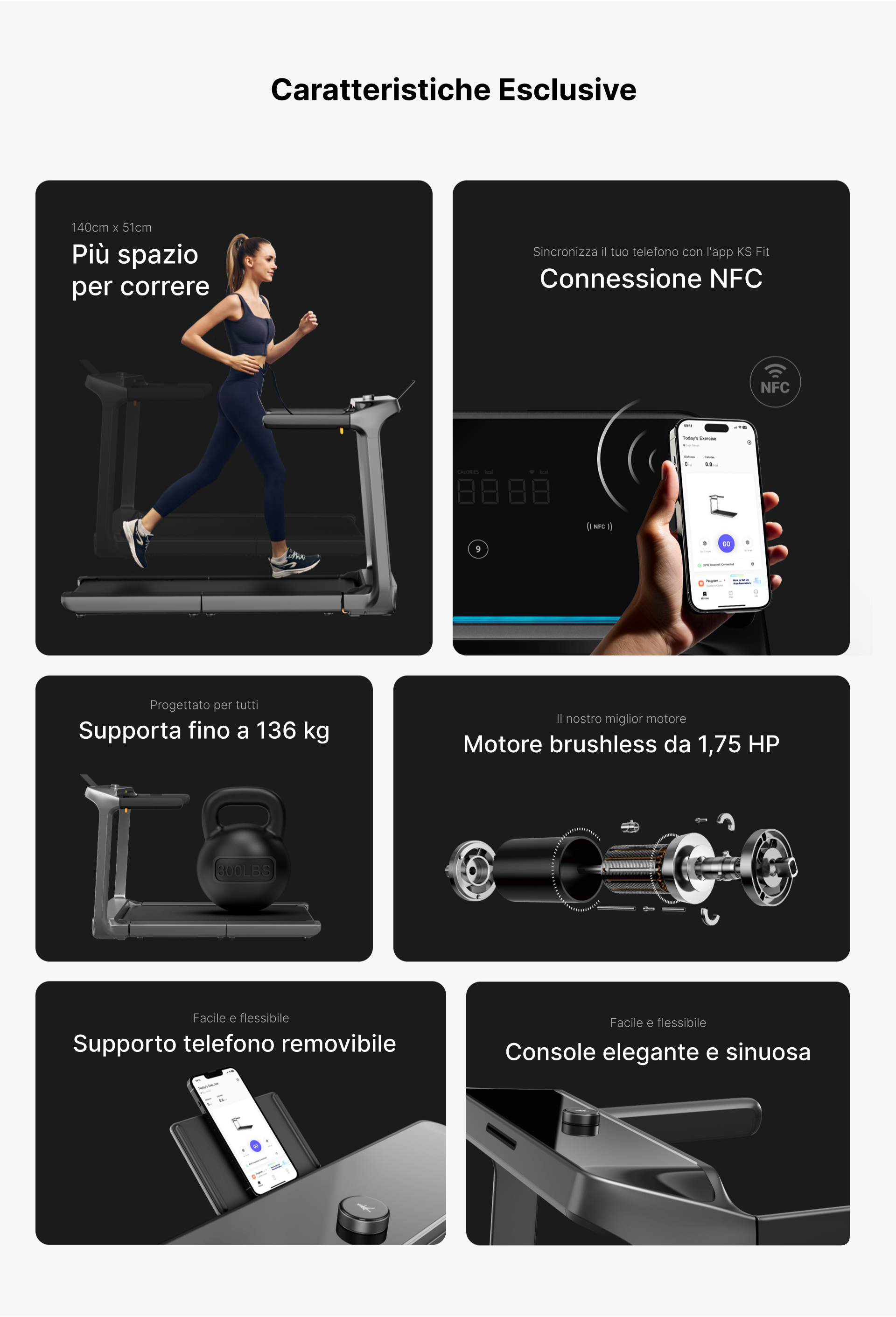 È dotato di un motore ultra-silenzioso da 1,75 CV e supporta fino a 136 kg. Include un display LED che mostra tempo, velocità, distanza, calorie e frequenza cardiaca, e una cintura di corsa antiscivolo a quattro strati per maggiore comfort e sicurezza.